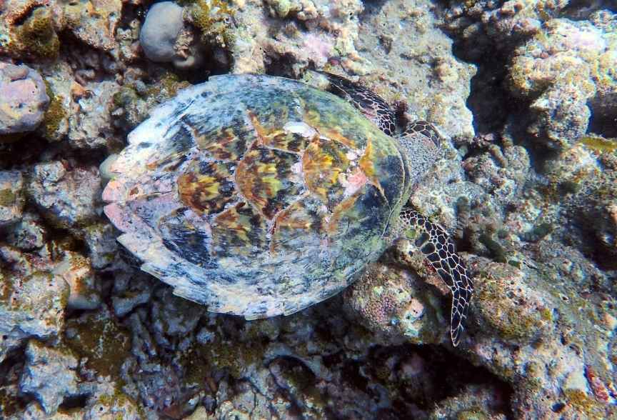 A hawksbill’s shell shows both its beautiful natural patterns and epibiome such as algae.