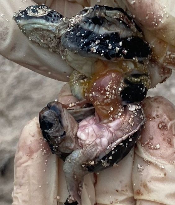 Twinning happens by chance when a fertilized egg cell divides in an unusual way, creating two identical turtles instead of one. Unfortunately, most twins in sea turtle eggs don’t survive until hatching. The egg likely doesn’t provide enough energy for both embryos to develop properly, or one or both may have genetic defects that aren’t visible. Even if a pair of twins were to hatch successfully, we’d never know since hatchlings from the same nest look almost identical.