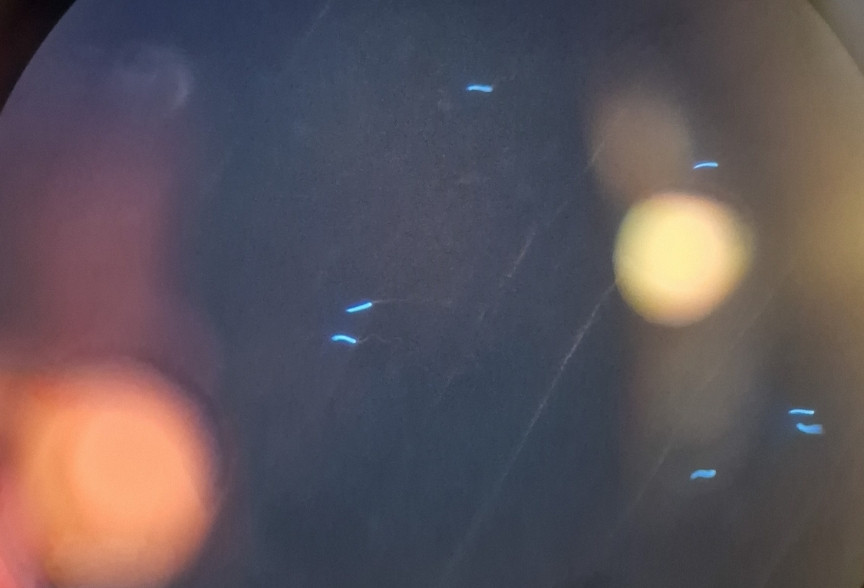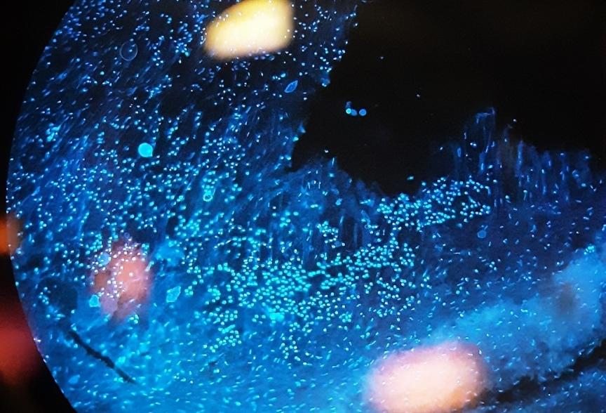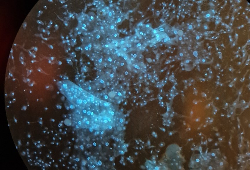 The dye makes these tiny cells glow a bright blue under a fluorescence microscope – almost appearing like a glowing constellation of stars in the night sky.