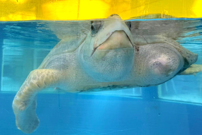 Turtle patient Karaa, a flipper amputee, recovering in the tank at the Rescue Centre. Image.